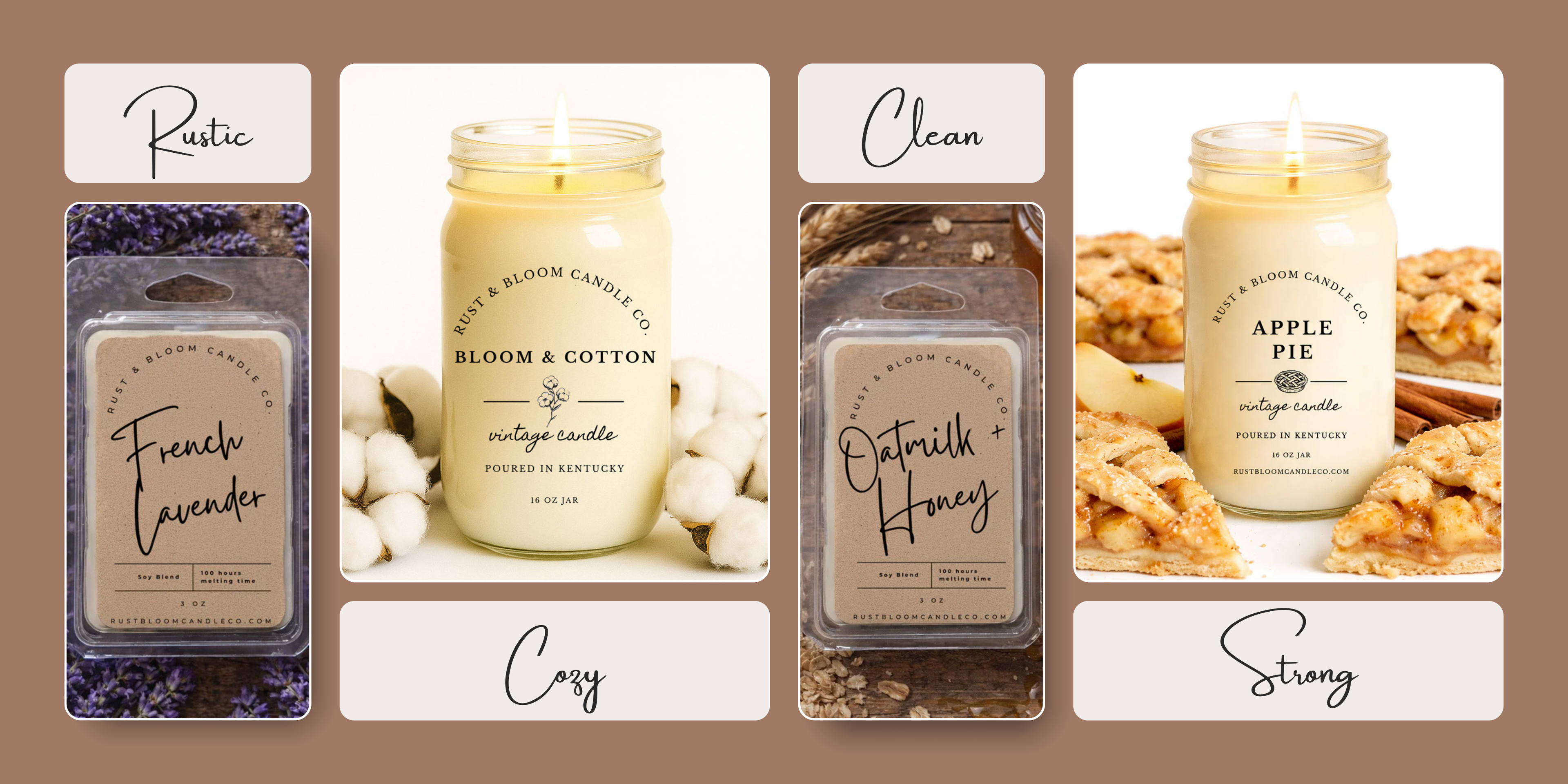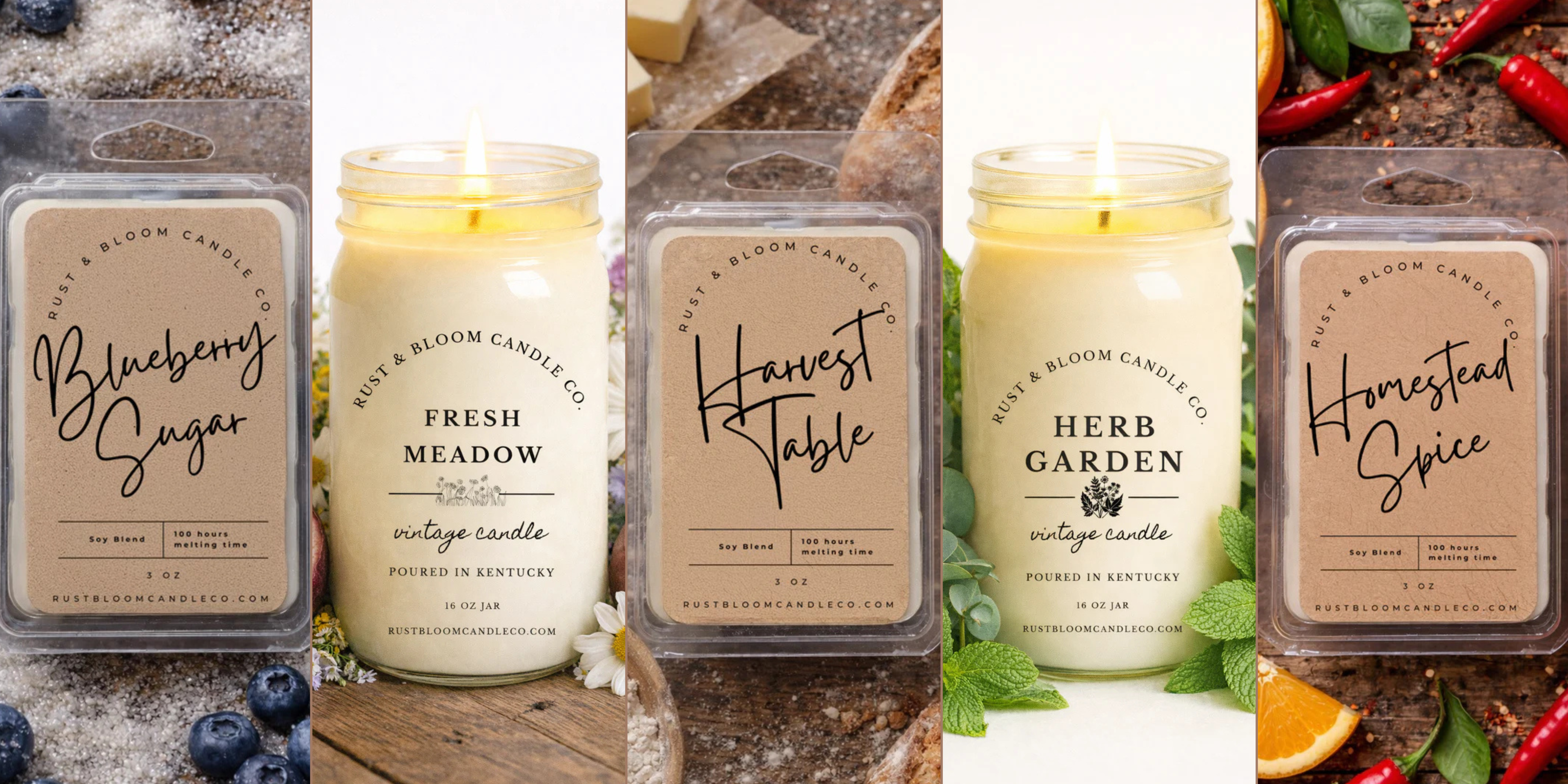 At Rust & Bloom Candle Co., we believe fragrance should feel intentional — not overwhelming. Every candle and wax bar is hand-poured in small batches using full soy wax, cotton wicks, and carefully blended fragrance oils.